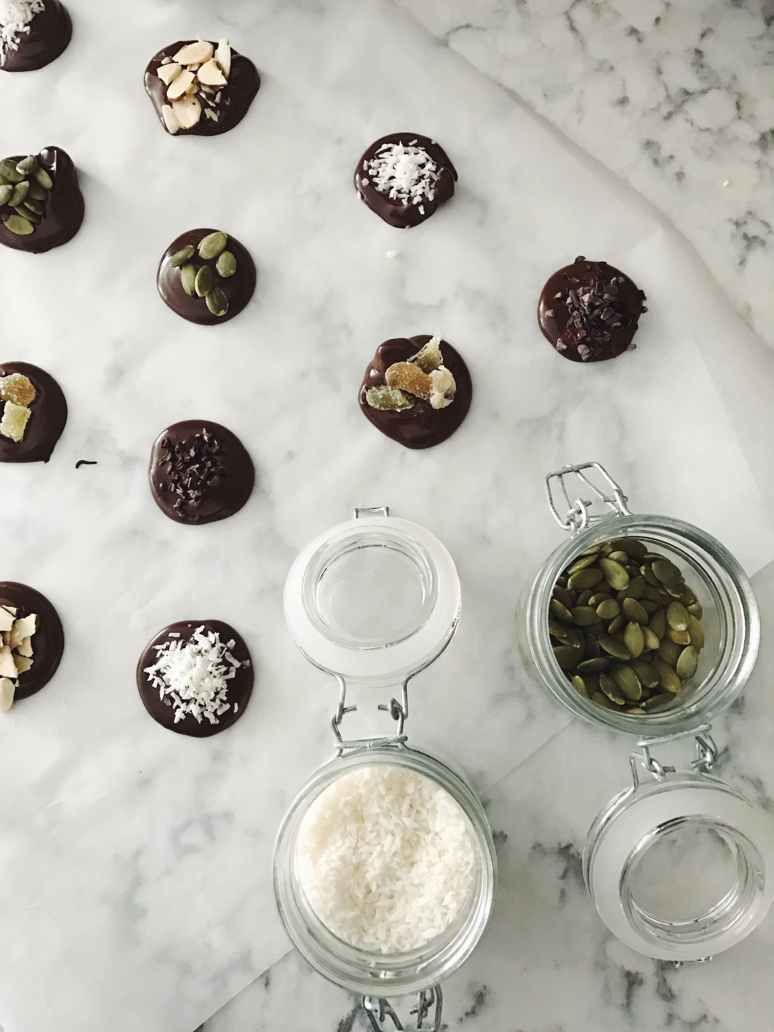 1. Gather your toppings. I selected raw pumpkin seeds, shredded coconut, shaved almonds, dark chocolate shavings, and candied ginger.