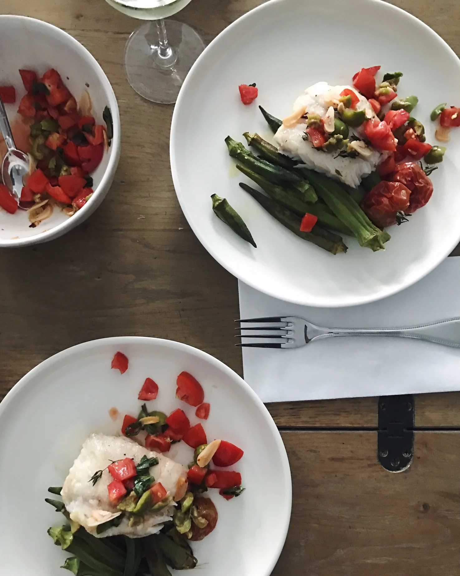 My husband Alex usually comes home with a pair of dirty boots and, on special occasion, a bottle of my favorite rosé or flowers; but this Monday, he surprisingly lugged in a bag of fresh okra and just-ripe heirloom tomatoes from a long-time customer. I seized the opportunity to reimagine my fillet of grouper that I had anticipated baking for dinner that evening.