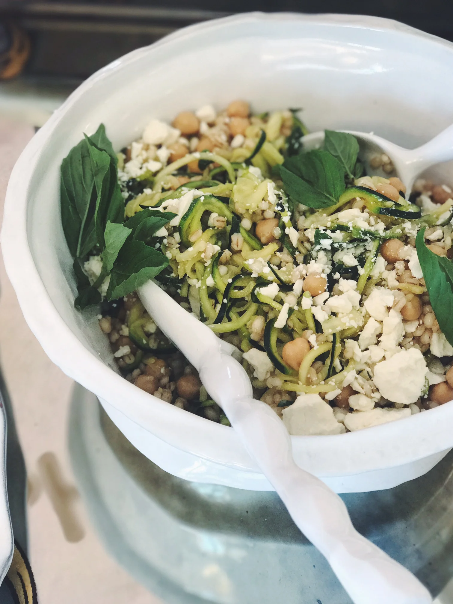 The beauty of this salad is in the contrast of its textures: hearty chick peas, earthy barley, smooth zucchini, crumbly feta. It's a union of so many vivid garden-inspired colors and flavors, folded into the lightest yet most luxurious lemon vinaigrette.
