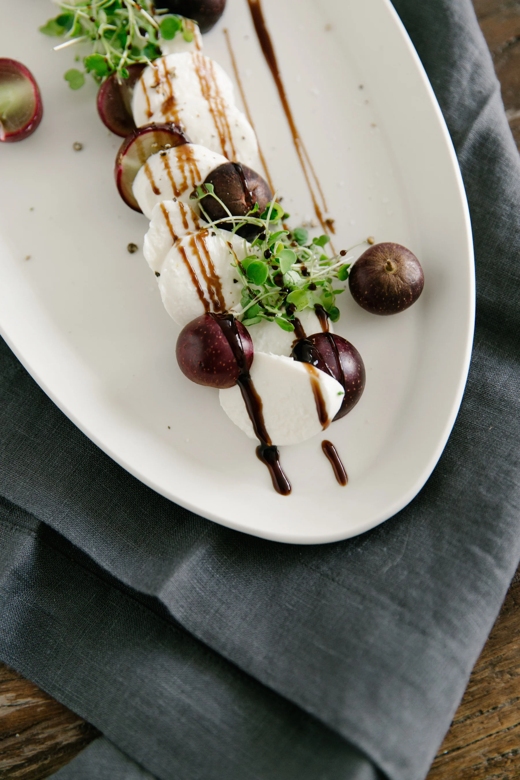 1. Artfully and imperfectly arrange mozzarella and grapes in a pattern along the center of a serving piece.
