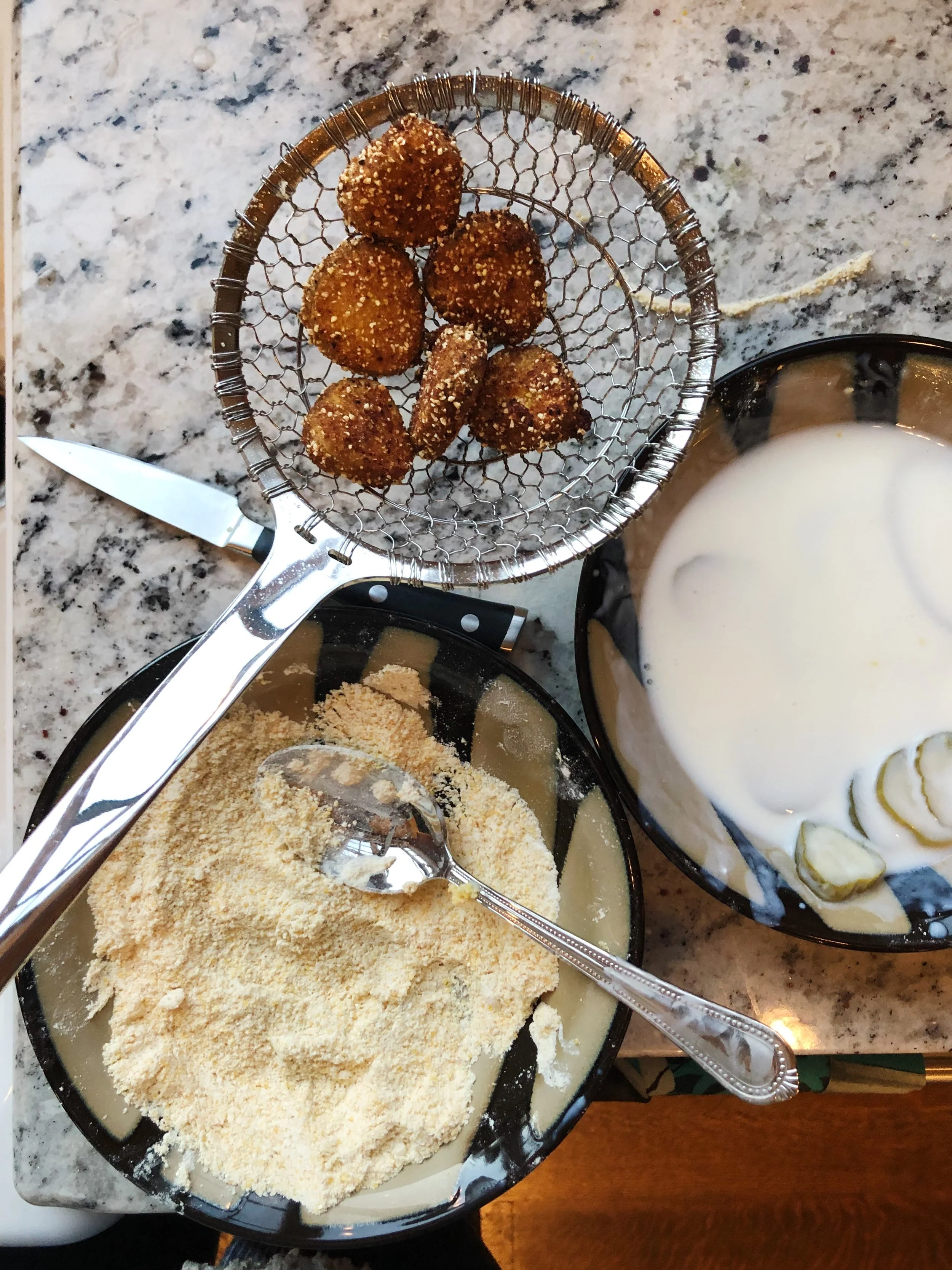 In my opinion, this recipe could be a game-changing Thanksgiving Day starter that gets the whole family involved. Pick your station—buttermilk dunking, cornmeal dusting, frying, seasoning or serving! Enjoy and indulge, y’all. And happy early Thanksgiving!