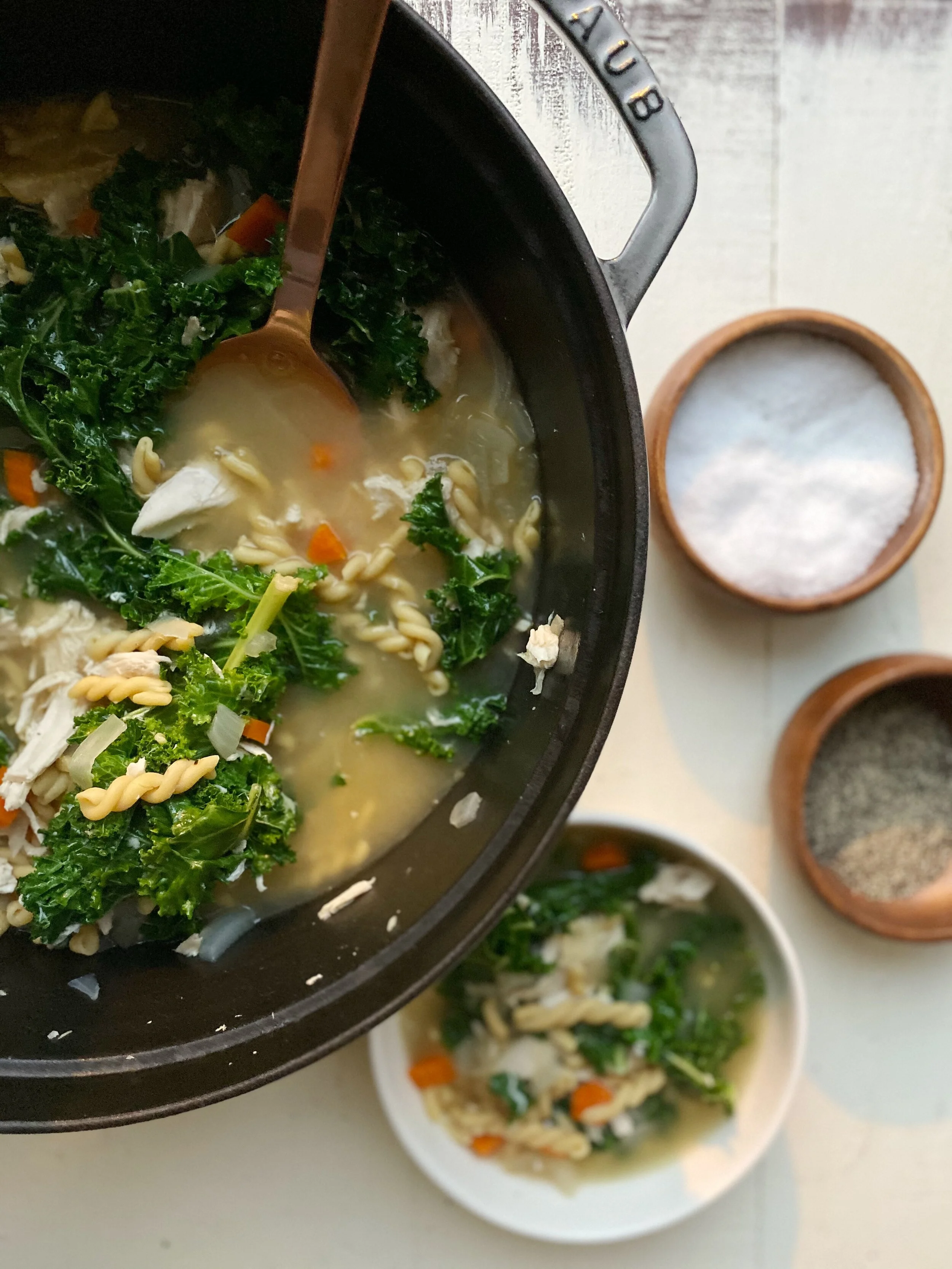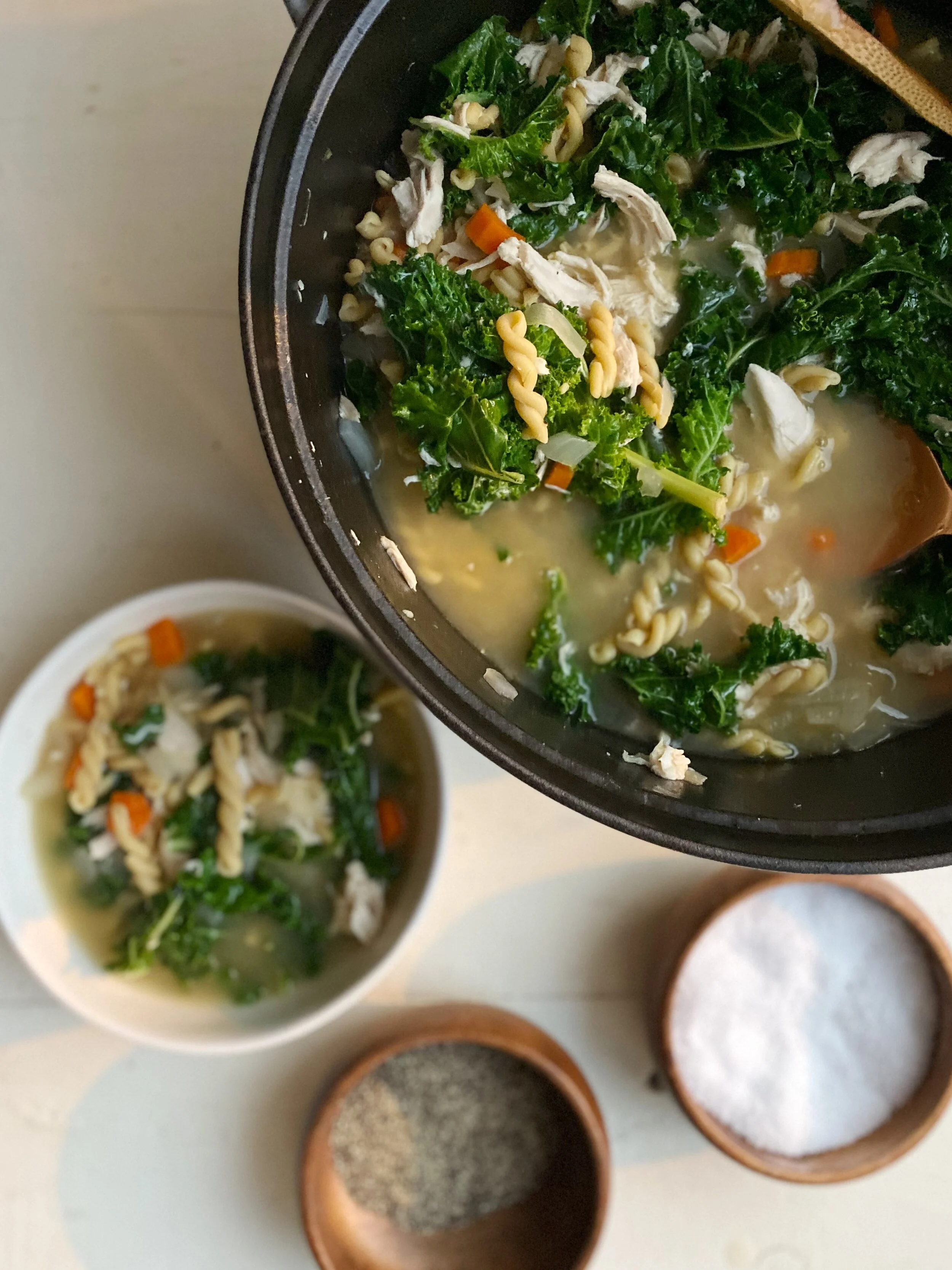 3. Remove pot from heat and add chicken, salt and pepper to taste. Stir well. Add kale and continue to stir until bright green and wilted. Taste and season appropriately. Remove parmesan rinds and discard. Ladle into bowls and serve hot.