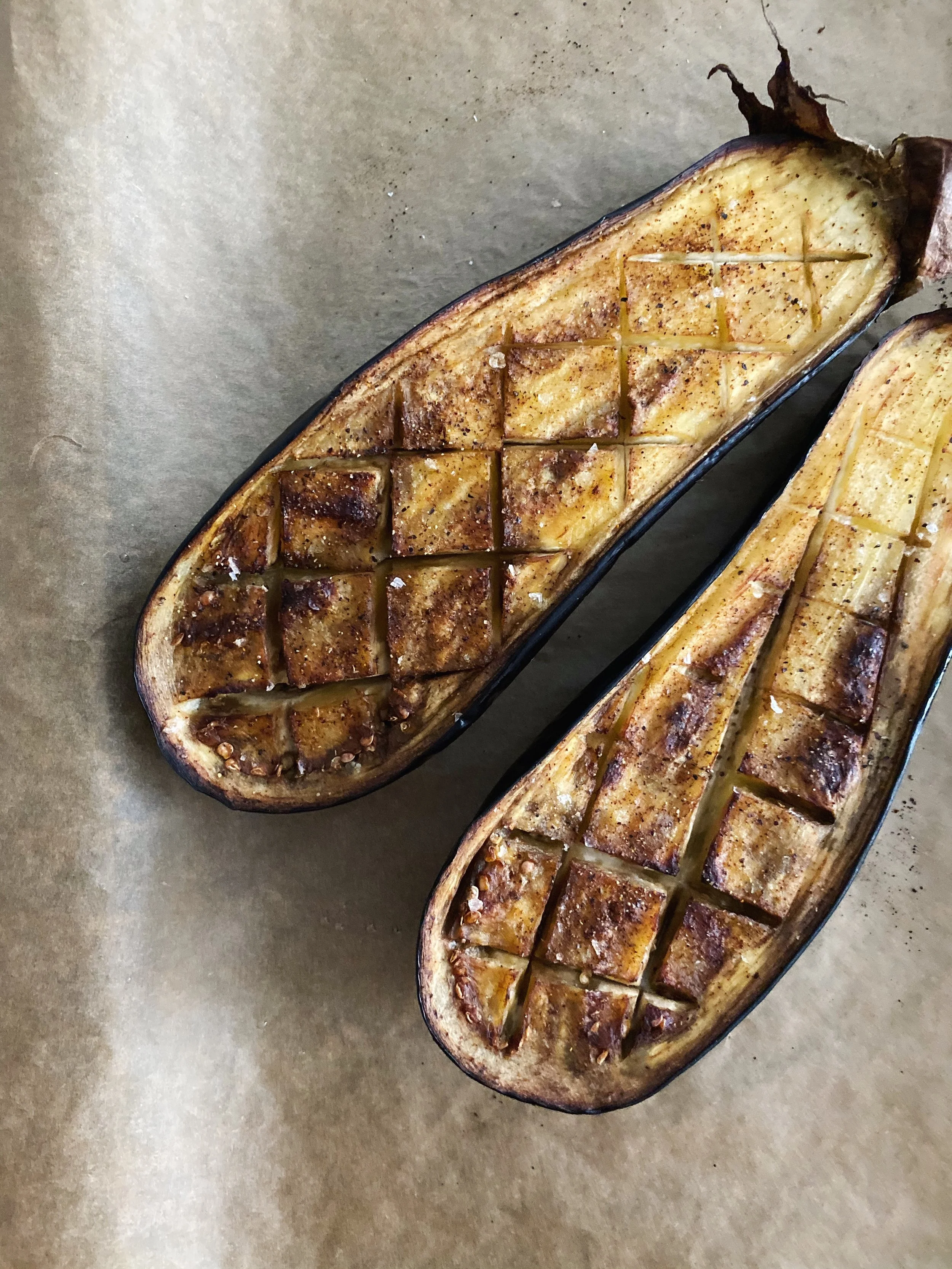2. Halve eggplant lengthwise and, using tip of sharp knife, score each side to create squares (for better roasting + easy serving!). Generously brush with olive oil, covering all the crevices. Season with salt, pepper and harissa. Place in the oven for 40 minutes.
