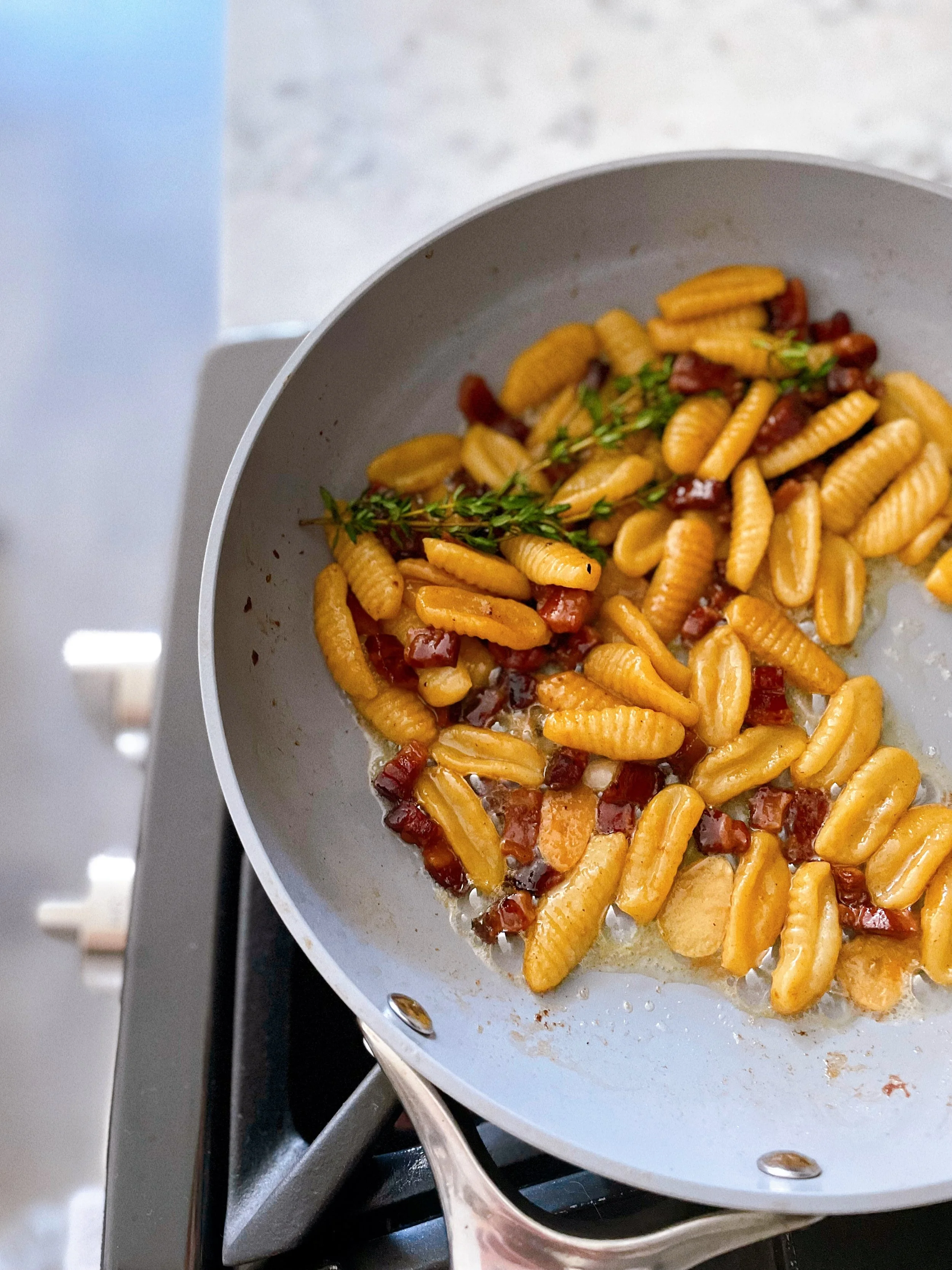 Meanwhile, bring a pot of salted water to a boil. Add remaining oil and bacon to a nonstick skillet and cook over medium-high heat, stirring often to brown the bacon bits. Reduce heat to medium-low once browned. Add pasta to boiling water and cook until al dente. Carefully pour 1/2 cup of pasta water into the skillet with bacon. Stir in garlic and fresh thyme, deglazing the pan. Add cooked pasta and butter, continuing to cook for 1-2 minutes. Discard thyme sprigs.