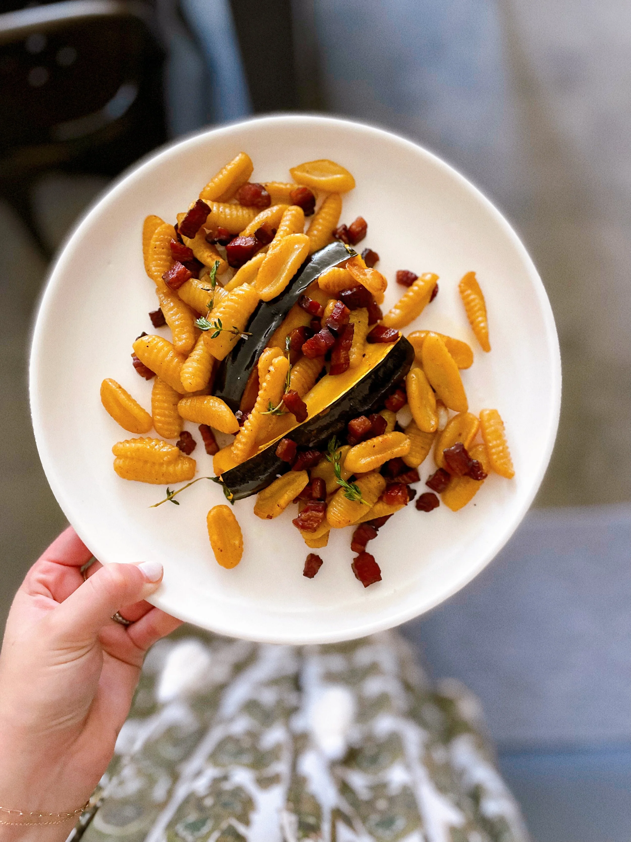 We kicked off this fall with Memphis’ own Chef Jimmy Gentry. I love the seasonal spin on a three-course meal that transforms our kitchens into culinary powerhouses! The pasta course we cooked and enjoyed together was the epitome of autumn. Butter, herbs, bacon, and squash — name a better combo? Here’s an adaptation of Chef Gentry’s pasta course that I’m still dreaming about: