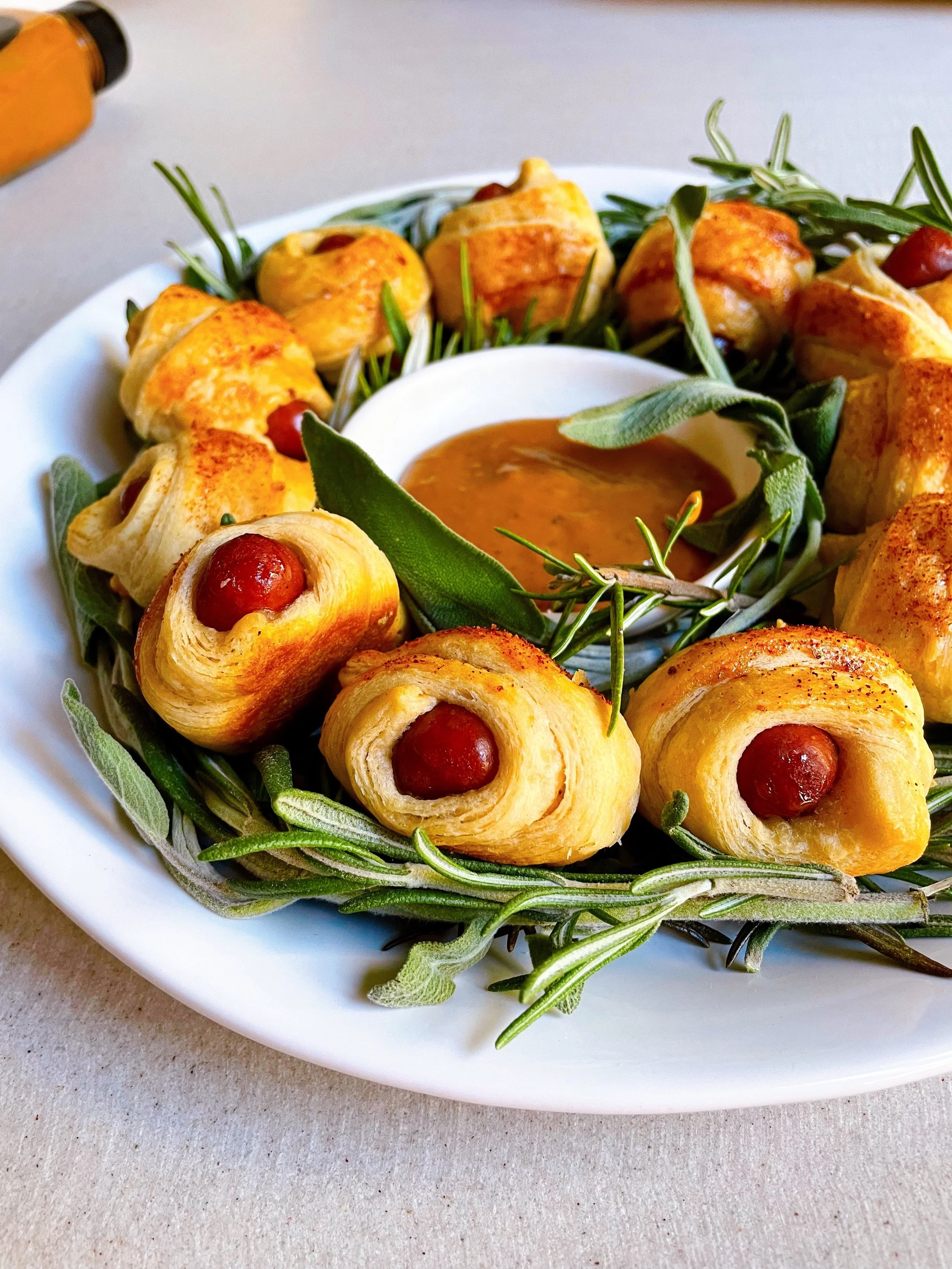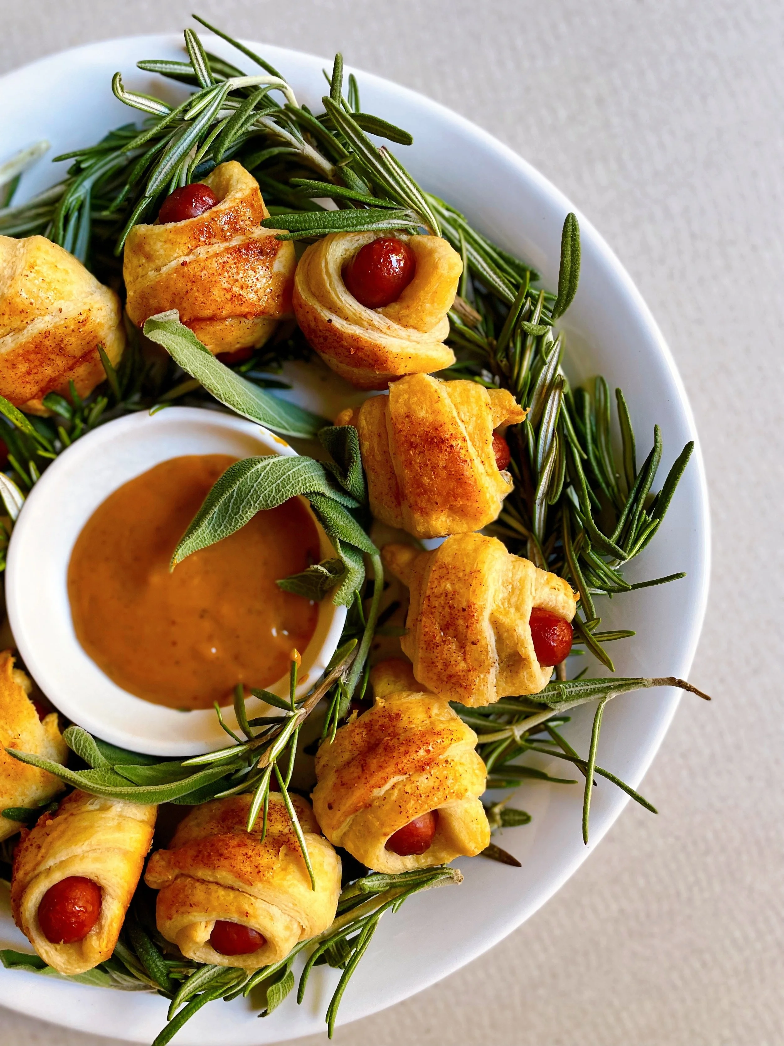 While baking, arrange fresh herbs around the perimeter of a round platter. Pour mustard in a small bowl in the center of the platter. Once baked, arrange pigs in a blanket in a round. Serve immediately.